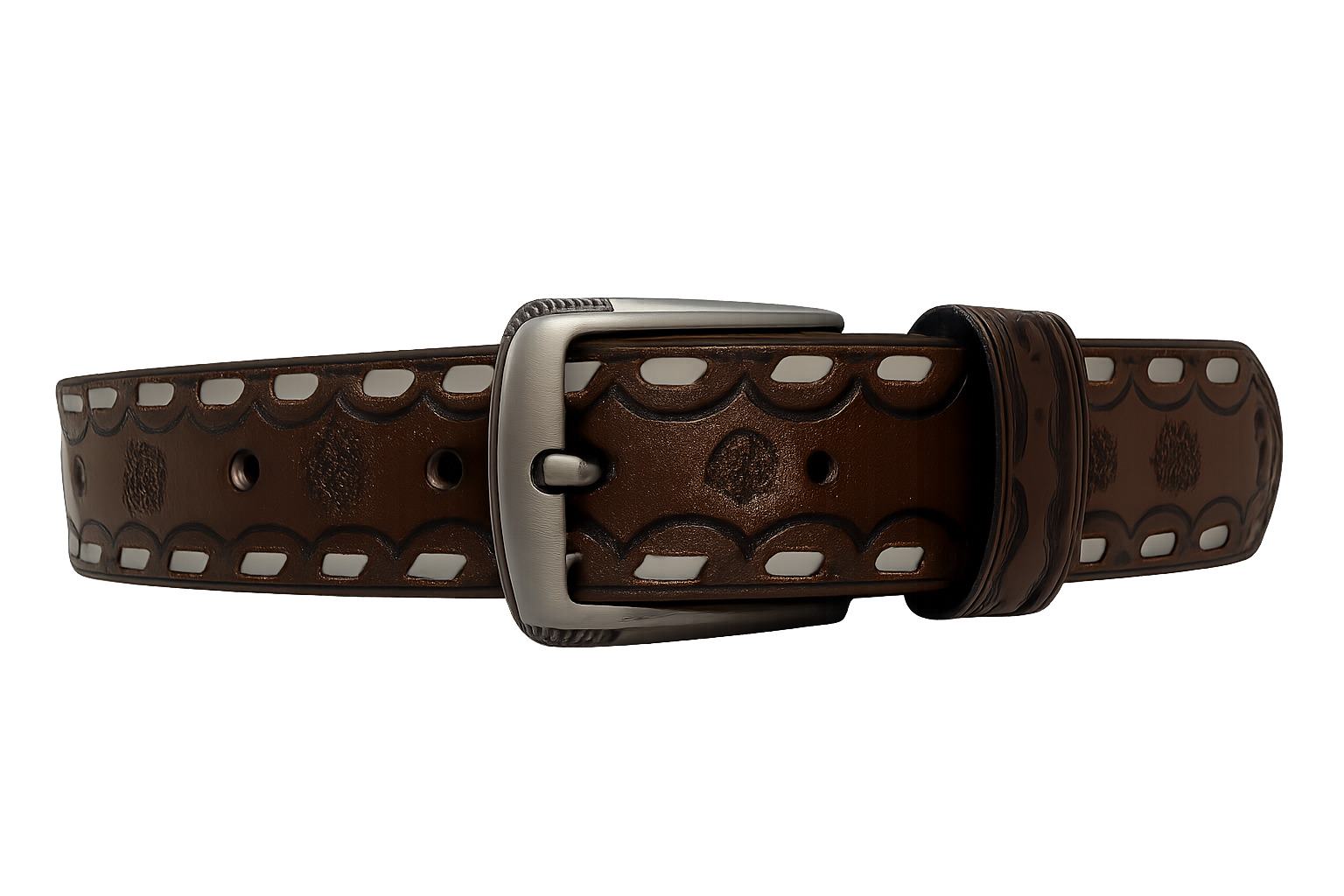 Built from genuine full-grain leather, this Western belt features a classic scalloped border accented with bold, buck white stitching for high contrast and a clean ranch look. The chestnut finish shows natural grain and pairs with a brushed silver buckle for everyday durability.