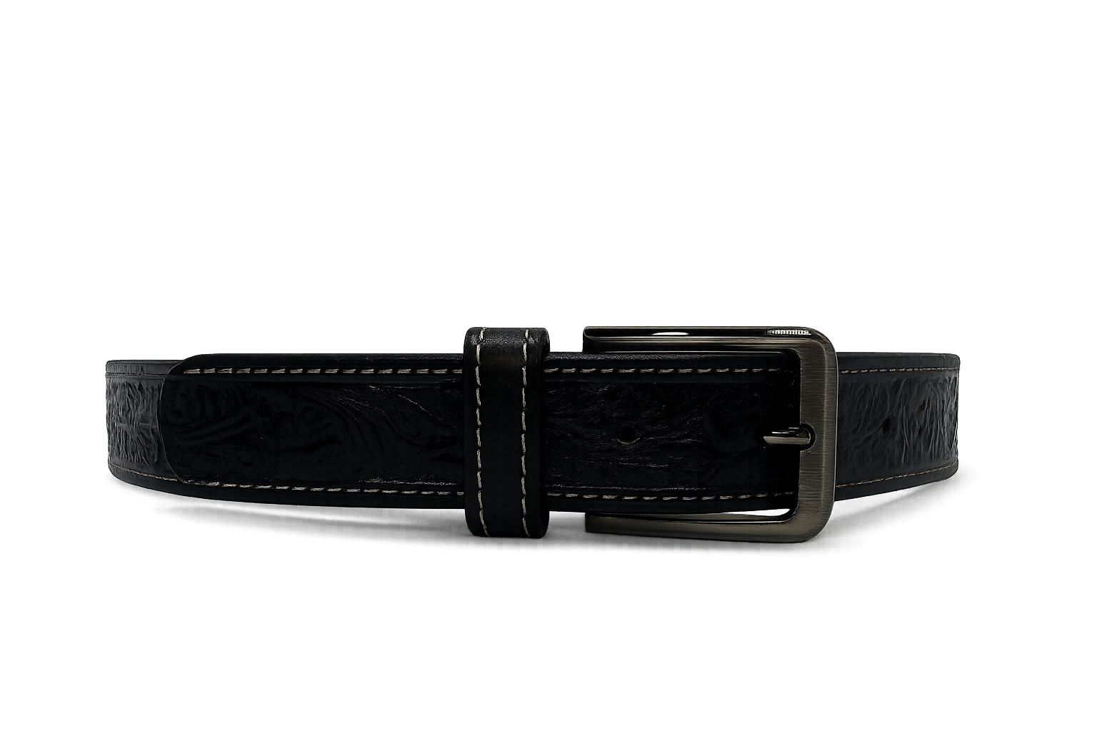 This embossed full-grain leather belt delivers classic Western style with a modern, clean finish. The deep black leather features a detailed floral embossed pattern, accented by bold white contrast stitching for a crisp, high-quality look.