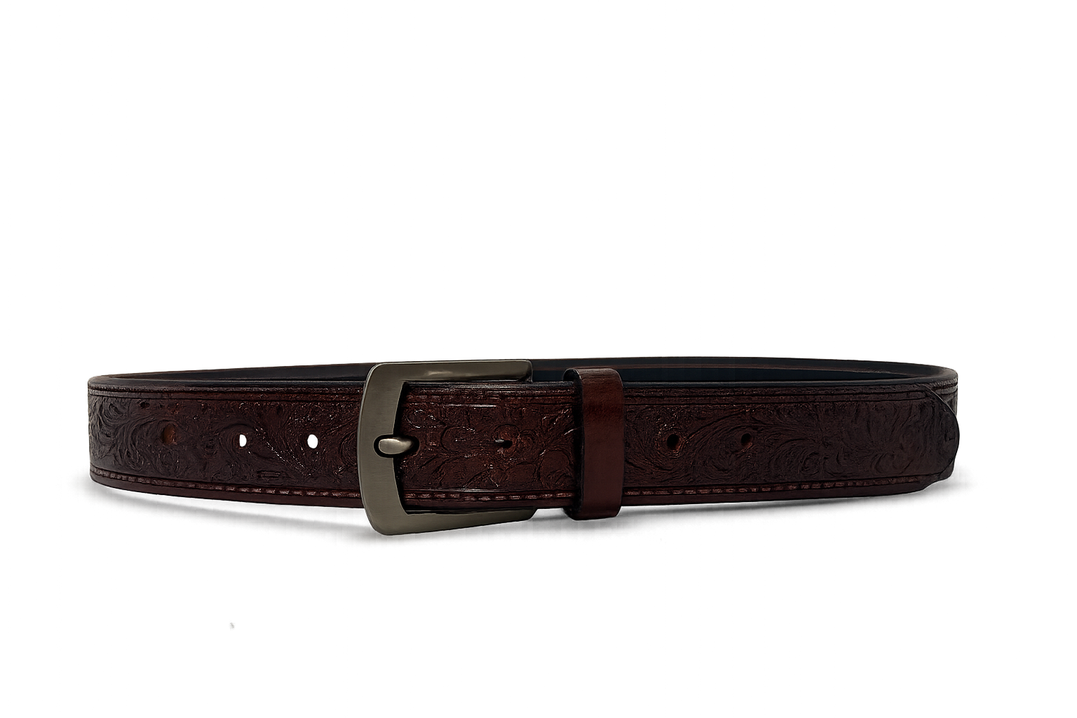 This full-grain leather belt is hand-tooled with an intricate Western floral pattern and finished in a dark mahogany/oxblood tone—deep brown with a subtle red cast that shows off the tooling beautifully. A brushed silver buckle and single-stitched edges keep it clean, durable, and ready for everyday wear.