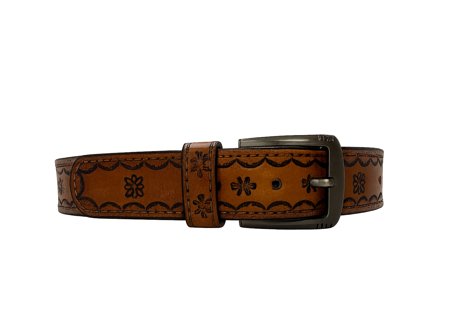 Hand-Tooled Western Leather Belt – Natural Tan Floral - 36 Inches